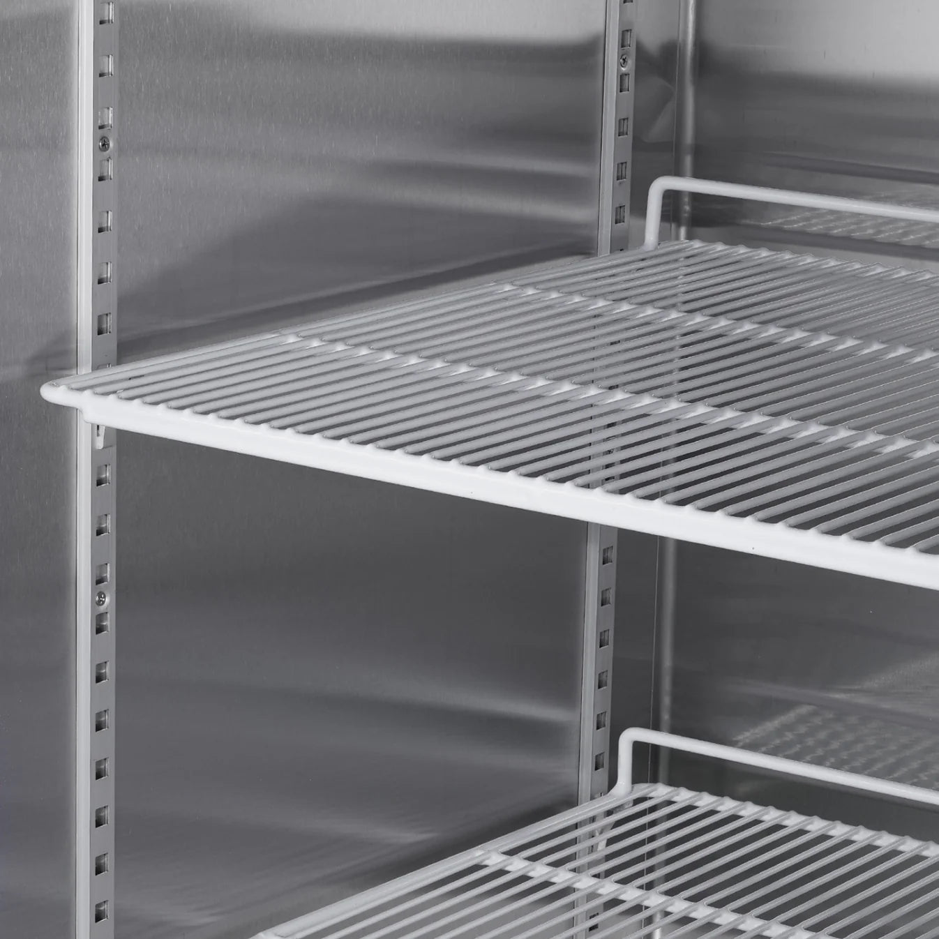 Durable Construction: Food-grade stainless steel inside and out, fingerprint-resistant finish, solid insulated doors with automatic self-closing.