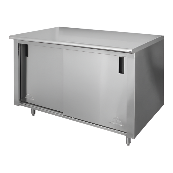 The Advance Tabco CB-SS-244 enclosed base commercial work table's sliding doors feature recessed handles for easy opening and closing.
